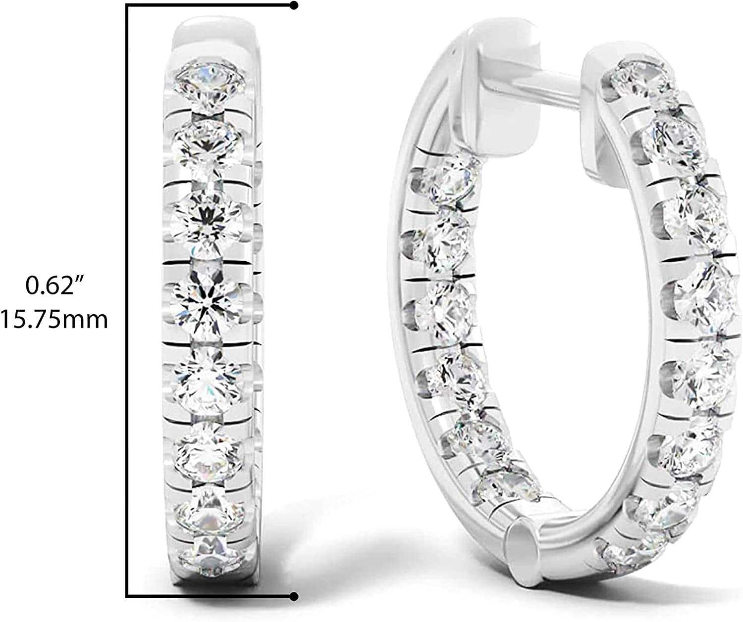 - ETERNAL ELEGANCE - These stunning sterling silver laboratory created diamond inside outside hoops are set with 1 carat in total of sparkling round brilliant lab grown diamonds. Our huggie style hoop earrings are versatile and the perfect complement to any outfit, dressy or casual. The gems are set in prongs down the outside of the front of the earrings and the inside of the back, serving sparkle from every angle. Measuring 5/8” diameter, these are the perfect size for everyday wear!